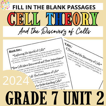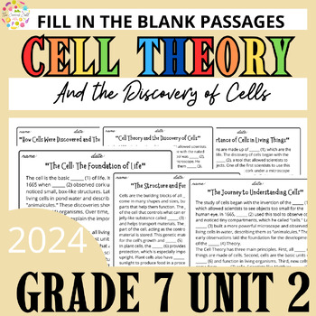 Explore the foundations of biology with Cell Theory and the Discovery of Cells (Unit 2)! This 7th-grade science resource features 7 fill-in-the-blank passages that engage students and reinforce key concepts like the principles of cell theory and pivotal discoveries in cell biology.