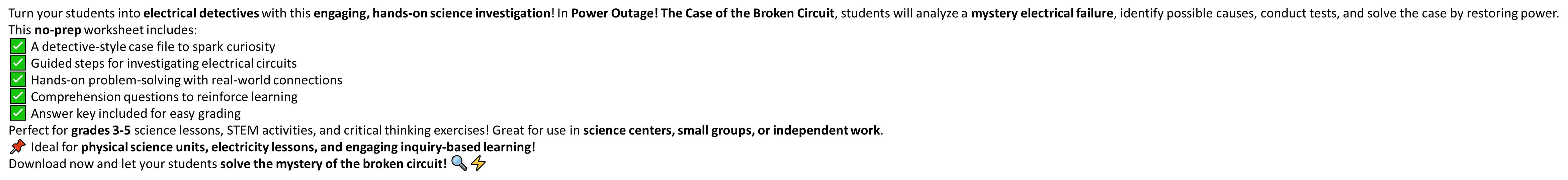 Power Outage! The Case of the Broken Circuit | Science Detective Worksheet$3$3https://schema.org/InStockusdthe curious cellthe curious cellI want this!Size361 KBLength5 pagesAdd to wishlist New wishlistShareShare on XShare on Facebook Copy linkCopy product URL